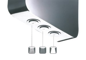 - la modalità nebulizzazione, che con un delicatissimo rilascio di migliaia di gocce d’acqua rinfresca o riscalda il corpo, per un momento di puro benessere;